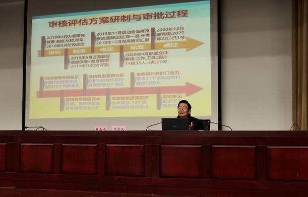 李志义以《抓住重点把握特点切实做好自评自建工作》为题,从新一轮审核评估的核心要义、实施要点、指标内涵以及学校自评自建四个方面作了详细解读。他指出,新一轮审核评估工作把全面贯彻落实党的教育方针和习近平总书记关于教育的重要论述作为根本指导思想,重点考察立德树人和三全育人工作机制、先进教育理念践行、质量保障体系建设等;要求高校始终把本科教育教学工作放在优先发展地位,落实“以本为本、四个回归”,做到“八个首先”;要按照“四个是不是”的标准抓好评建任务落实,全校每一个部门、每一名教职员工都承担着重要的人才培养责任和义务。同时,李志义结合审核评估案例,提出审核评估工作中的共性问题及注意事项。