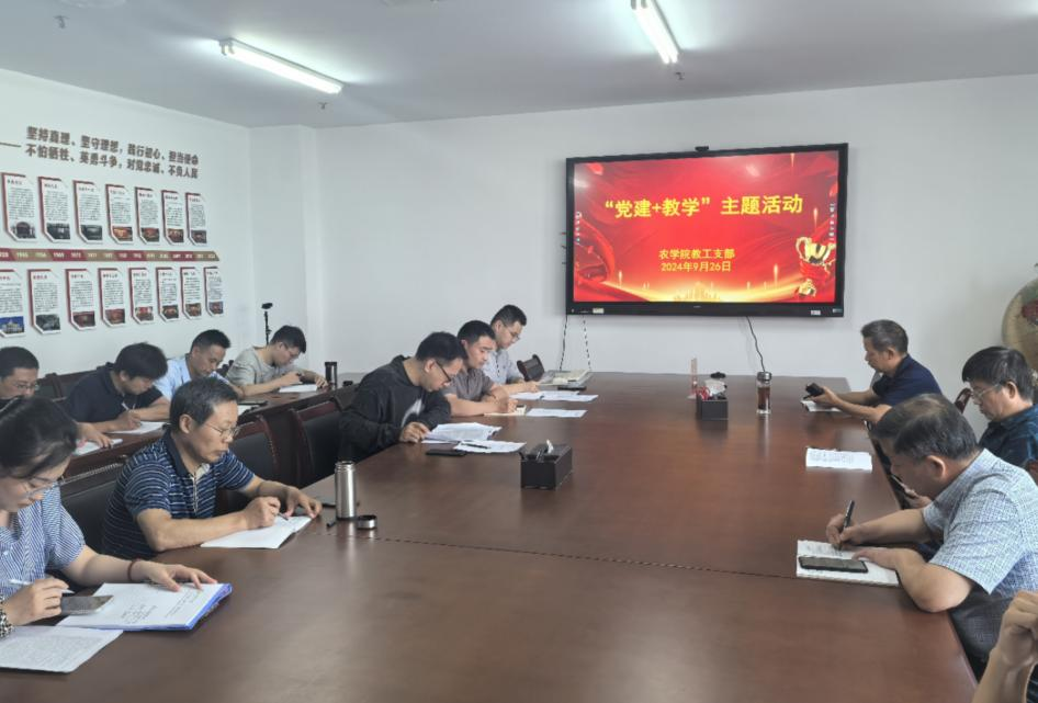 本网讯 9月26日下午,农学院教工第一、第二党支部在朝阳楼206会议室联合开展“党建+教学”主题活动。活动由副院长卢杰、教工党支部书记陈翔和黎珉共同主持,教工支部全体党员参会。
