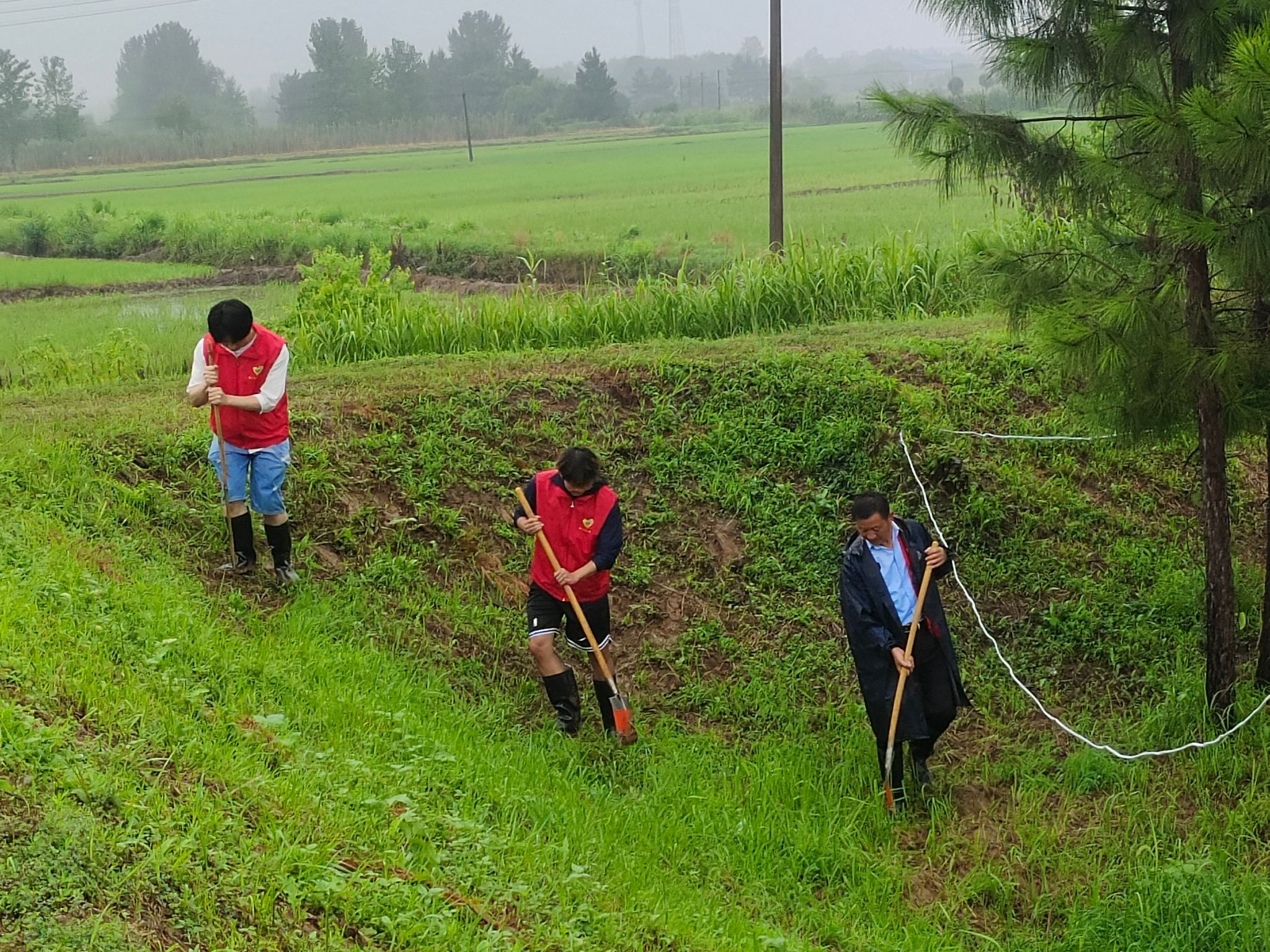 团队成员李洋、胡顺康脸上挂满豆大的汗珠,在当地退休干部带领下在大堤坡面仔细检查。“发现可能出现危险的地方就要及时补救,要保证防汛工作的全面性”,他们谨记防汛工作要点,整个上午都不敢放松一点警惕,确保大堤防汛正常进行后,李洋认真地说:“能为家乡防汛工作出一份力,我们感到特别自豪。”