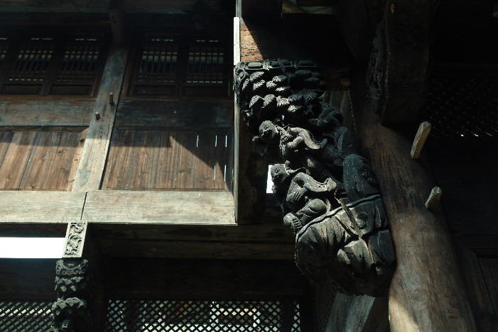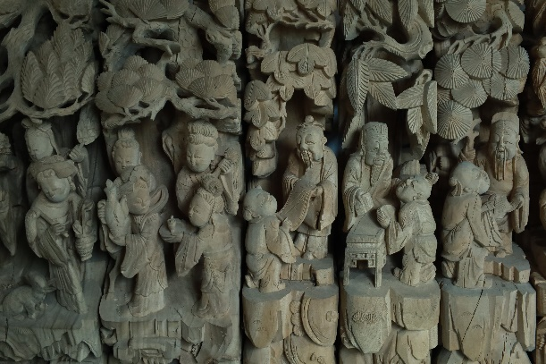 采访结束后,倪振兴先生带领团队参观了馆内一些保留完好的徽雕艺术作品,并详细讲述了雕刻的细节和取图寓意,徽州木雕的题材广泛,有人物、山水、禽兽、花木、鱼虫以及各种吉祥图案等,与砖雕与石雕相比,木雕更显精致。同学们不禁为匠人的智慧与高超技艺而赞叹不已、钦佩至极。