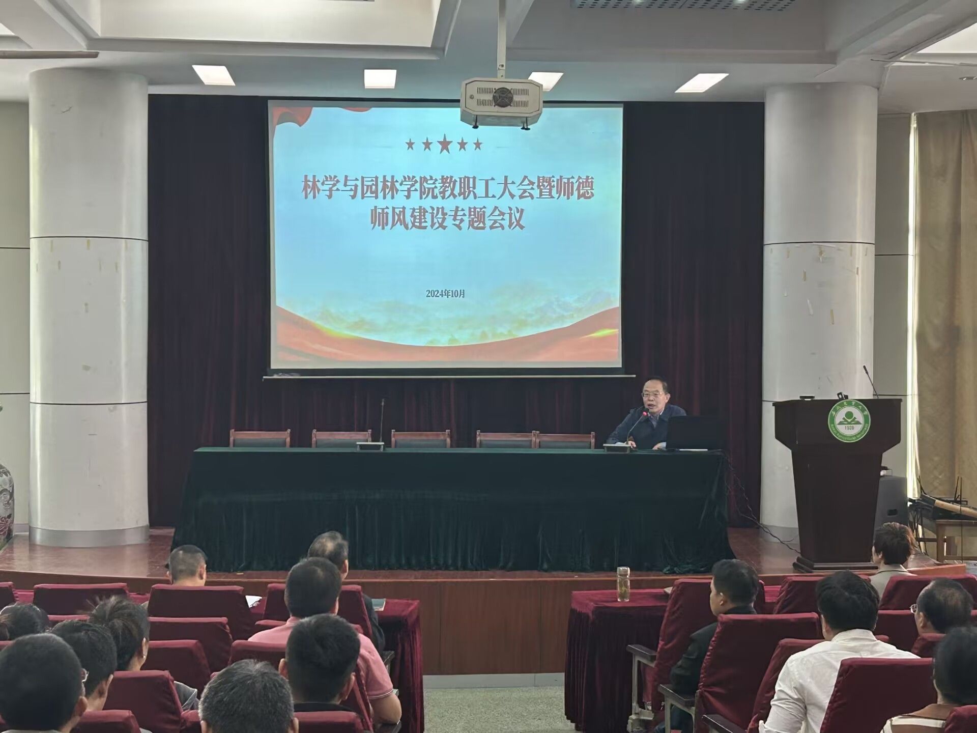 本网讯 为深入学习贯彻全国教育大会精神,加强师德师风建设,大力弘扬教育家精神,10月9日下午,林学与园林学院在林学楼一楼报告厅召开全体教职工大会暨师德师风建设专题会议。学院全体教职工参会,会议由学院党委副书记、院长徐斌主持。