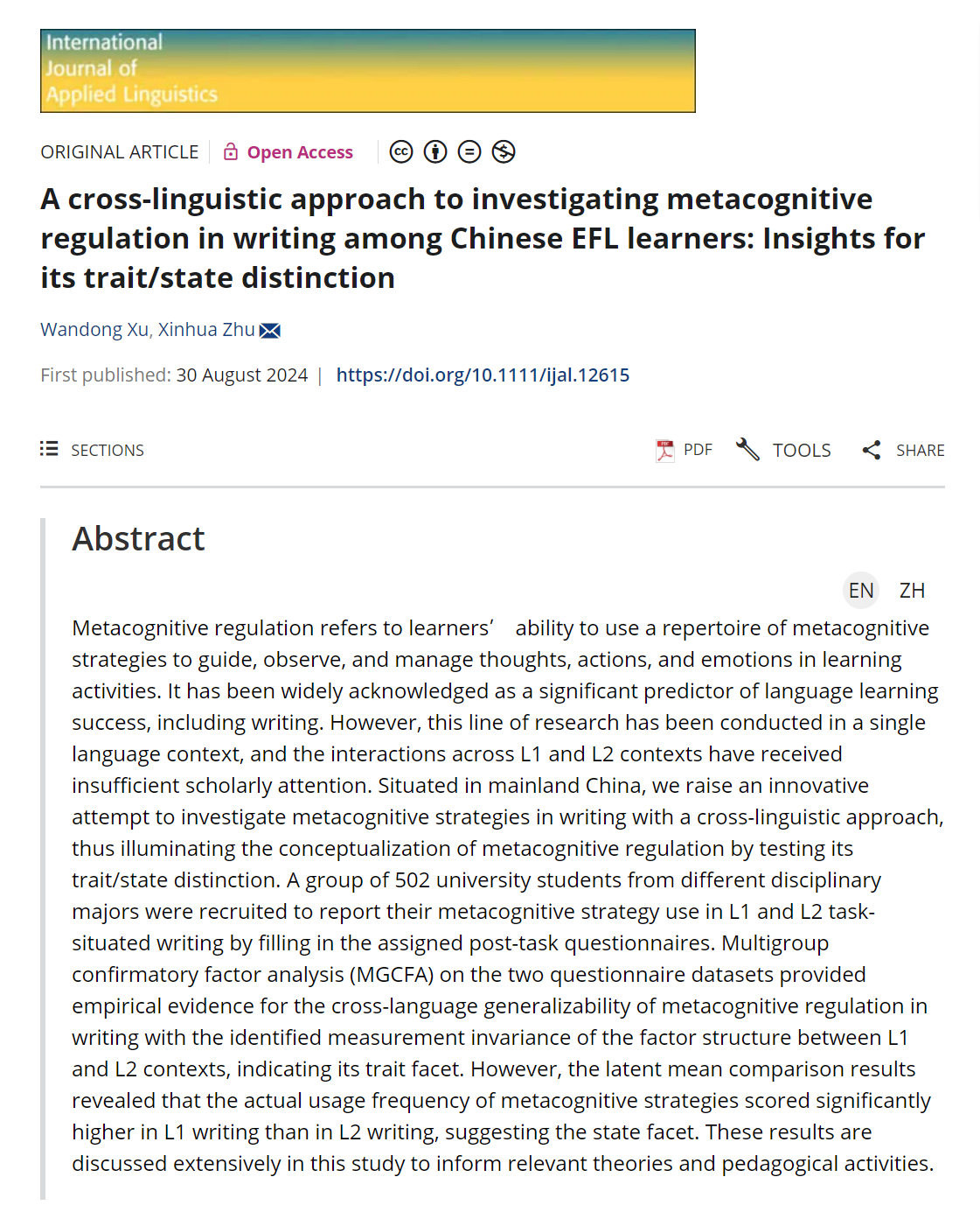 本网讯 近日,外国语学院英语系许皖栋博士在《应用语言学国际期刊》(International Journal of Applied Linguistics)(5-year journal IF = 1.9, Q2)发表题为《中国EFL学习者写作元认知调控的跨语言探究:特质/状态之见》(“A Cross-Linguistic Approach to Investigating Metacognitive Regulation In Writing Among Chinese EFL Learners: Insights For its Trait /State Distinction”)的实证论文。
