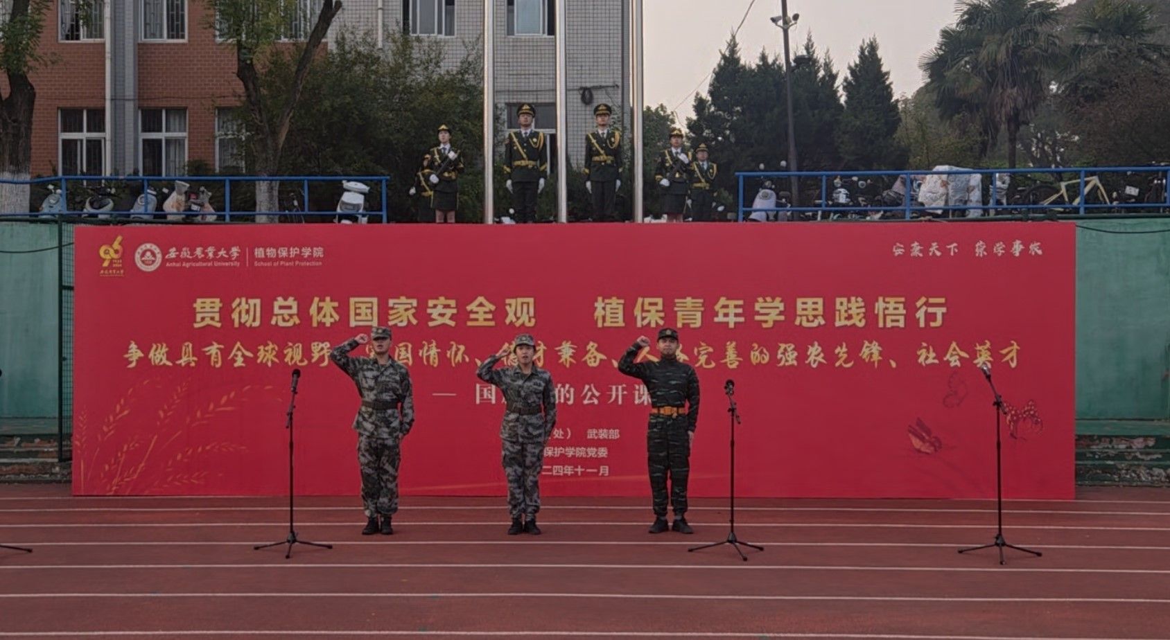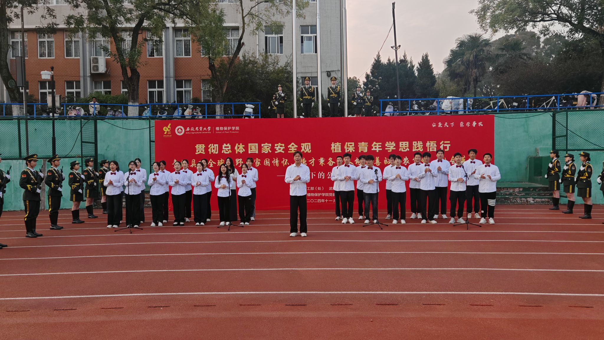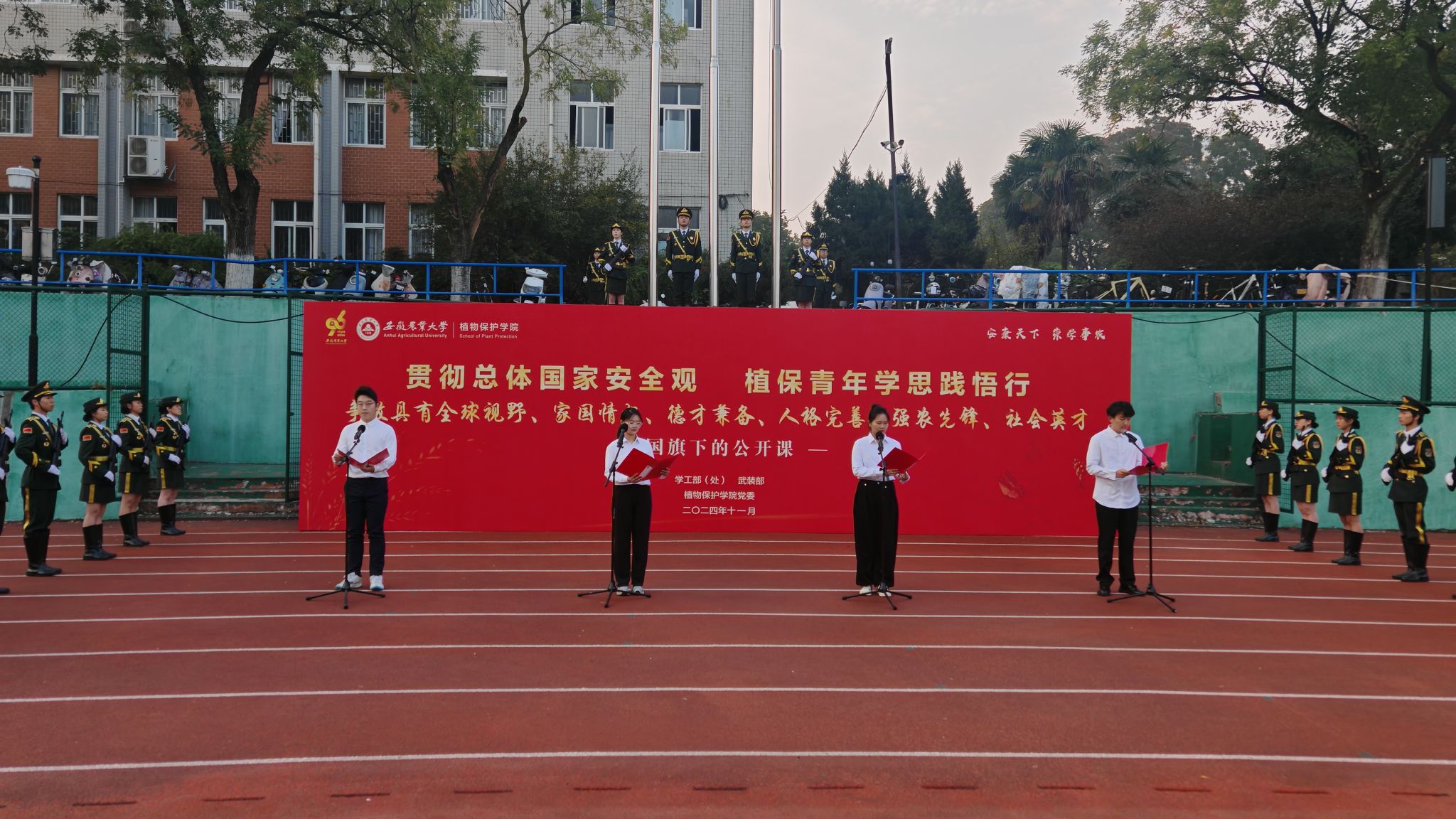 本网讯 11月4日上午,植物保护学院在校第一运动场举行了以“贯彻总体国家安全观 植保青年学思践悟行”为主题的96周年校庆主题升旗仪式暨国旗下的公开课活动。校党委学工部(处)、武装部负责同志卢伟出席活动。学院党政领导班子成员,全体专兼职辅导员、班主任,本科生、研究生代表参加活动。升旗活动由学院党委书记刘柳主持。