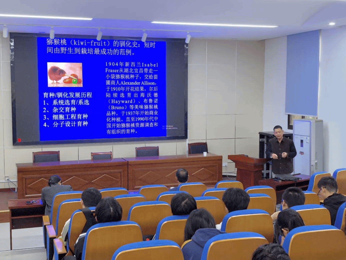 刘永胜教授从爱因斯坦相对论的提出出发,展示近代科学家孜孜不倦的科学探索之路和成果,深入浅出地讲解了生物起源及其奥秘;以“猕猴桃驯化与产业技术发展”为题,针对猕猴桃产业发展遇到技术瓶颈,详细讲述了猕猴桃的育种驯化史、种质资源挖掘的“三万里”艰辛历程以及在猕猴桃分子生物学、基因组学研究上形成的你追我赶实力比拼与技术优势。他生动地诠释猕猴桃产业各个“有趣”而又“重要”的科学问题,向同学们讲述了自身科研过程中的收获与挑战,鼓励同学们要树立专业自信,脚踏实地、勤奋学习。