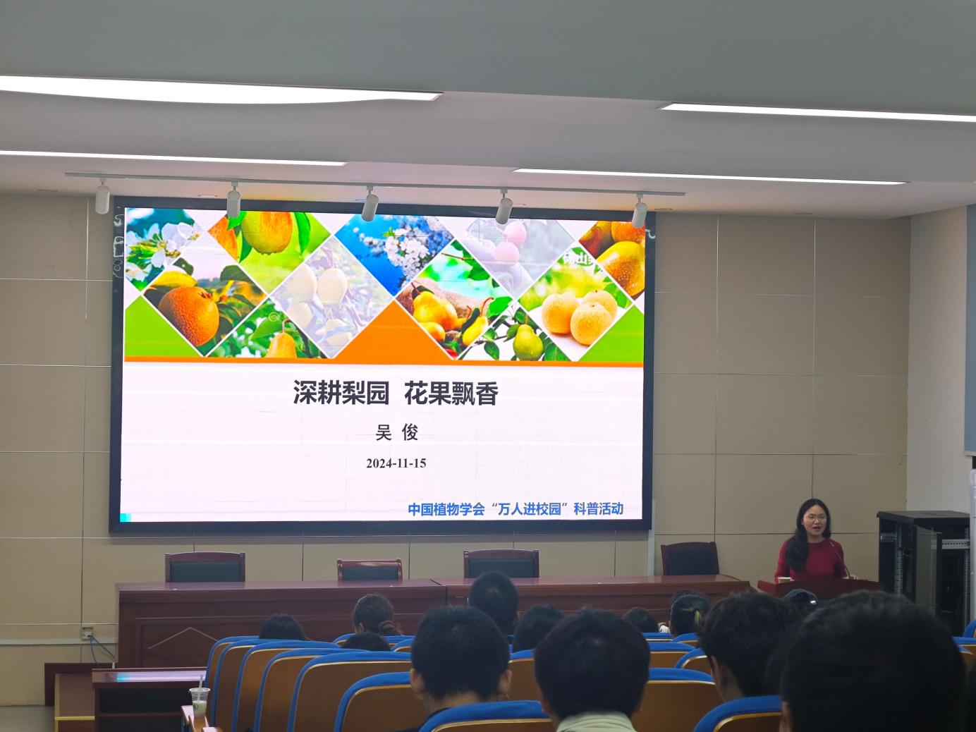 吴俊教授以“深耕梨园,花果飘香”为题,与同学们分享了自己的求学道路和科研经历,讲述了与园艺结缘、与梨园为伴的种种趣事,生动诠释了园艺产业在国家粮食安全中的重要作用、市场价值、发展潜力与未来发展趋势。并勉励同学们积极追求进步、汲取知识,注重培养团队协作精神,做有知识、会思考的时代青年。