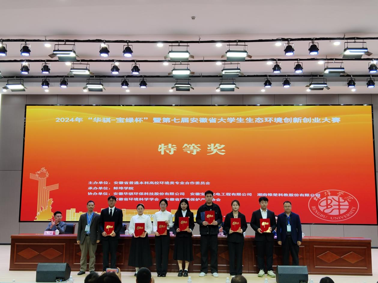 本网讯 11月16日,2024年“华骐-宝绿杯”暨第七届安徽省大学生生态环境创新创业大赛决赛在蚌埠学院落下帷幕,我院参赛团队荣获最高奖项省级特等奖,并取得了参加该类赛事的新突破。